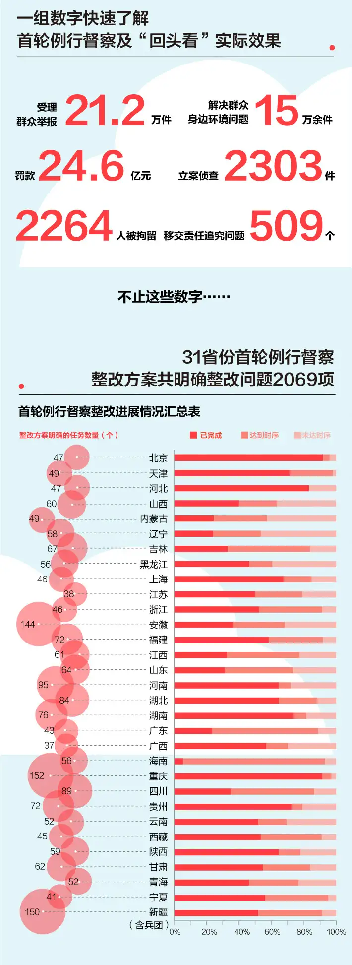 近日,在新一轮中央生态环境保护督察启动前夕,中办、国办印发《中央生态环境保护督察工作规定》,首次以党内法规形式,明确督察制度框架、固化督察程序和规范、界定督察权限和责任,展示了中央推进环保督察的决心。中央生态环保督察究竟有哪些好经验、好做法?让两办出台《规定》将其固化,施之长远。一组数字带您快速了解首轮中央生态环境保护督察及“回头看”成效 。