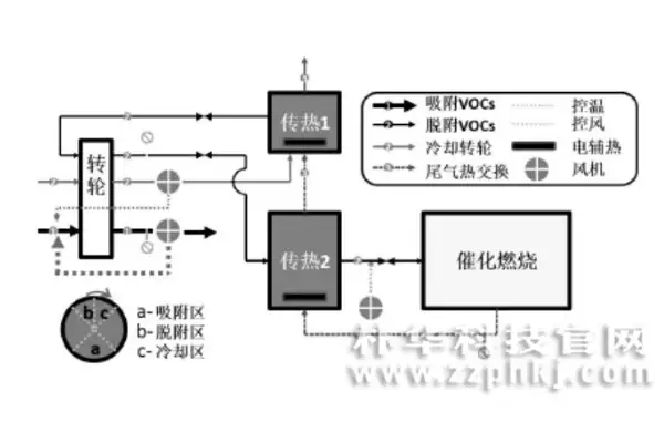 (2)旁路建立冷却风系统。当情况复杂的工况下,VOCs的浓度可能会瞬间增高,在这个时候,有少部分的风量会分到吸附区,从而降低风量的脱附,与此同时,会在传热2后添加新风,用来维持进入催化反应器的风量的额定范围,这个旁路是以新鲜的风对高浓度的VOCs进行稀释,但是这个方法会把工艺的时间变长。
