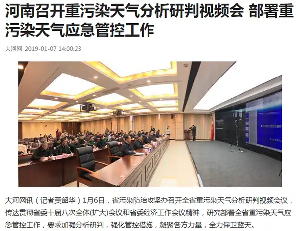 1月6日上午,河南省污染防治攻坚办组织召开重污染天气分析研判会,全省各省辖市和县区环保系统成员通过视频形式参会听会,两个多小时的全省视频会是河南环保开年第一个重要会议。据河南省环境监测中心预测,2019年第一季度,河南将长期处于不利气象条件当中,大气污染防治任务无比艰巨。