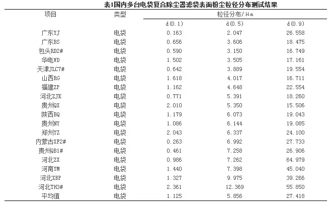 火电厂当前常用的袋式除尘器主要由电袋复合除尘器和纯袋式除尘器,这两类除尘器区别主要为进入袋区的烟尘浓度、烟尘粒径不同。朴华科技对国内多个火电厂数十台套的电袋除尘器和袋式除尘器滤袋表面粉尘粒径进行分析,结果如表1、表2上所示。